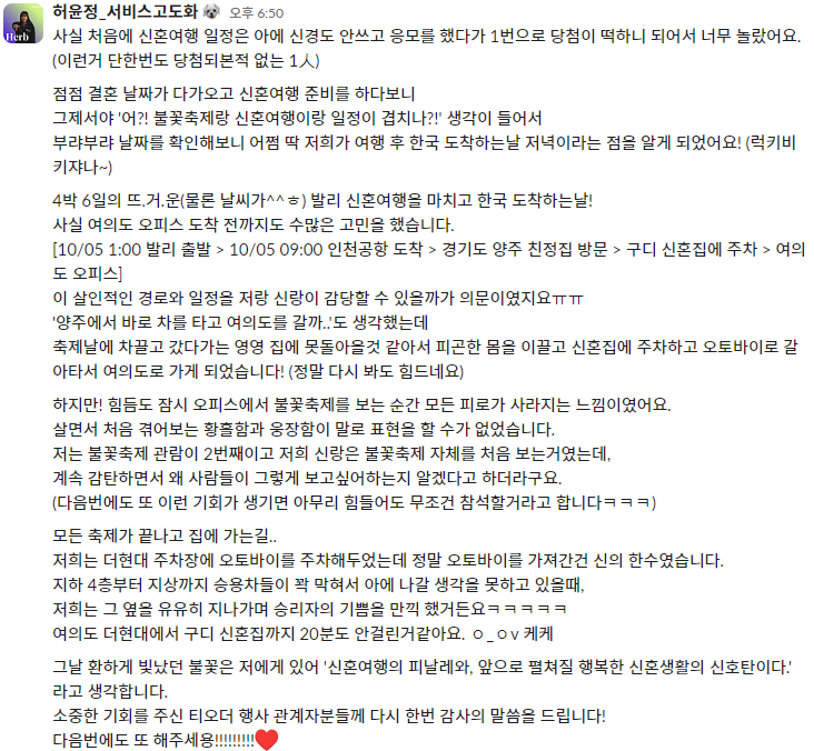 한국 도착 당일 불꽃 축제를 관람하고, 스쿠터를 타고 신혼집 귀가라니! 정말 낭만적인 코스네요! 윤정 님 다시 한번 결혼 축하드려요!❤️