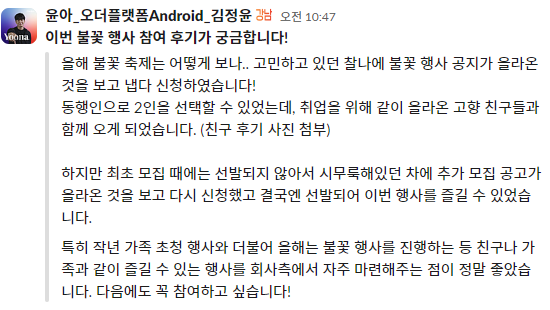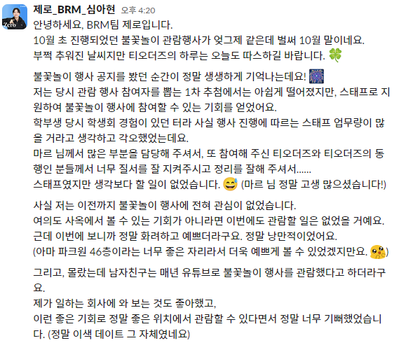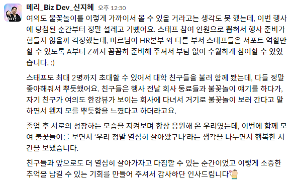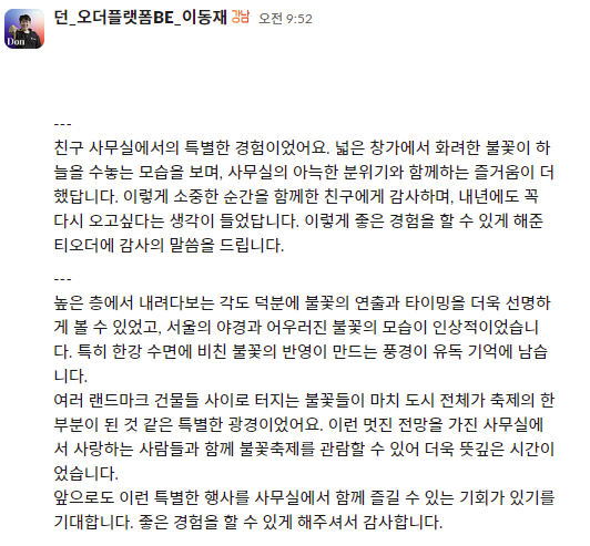 아쉽게도 작년 티오더는 막 파크원으로 사옥 이전을 해 불꽃놀이는 보지 못했답니다. 😭 하지만 올해는 다르죠!
