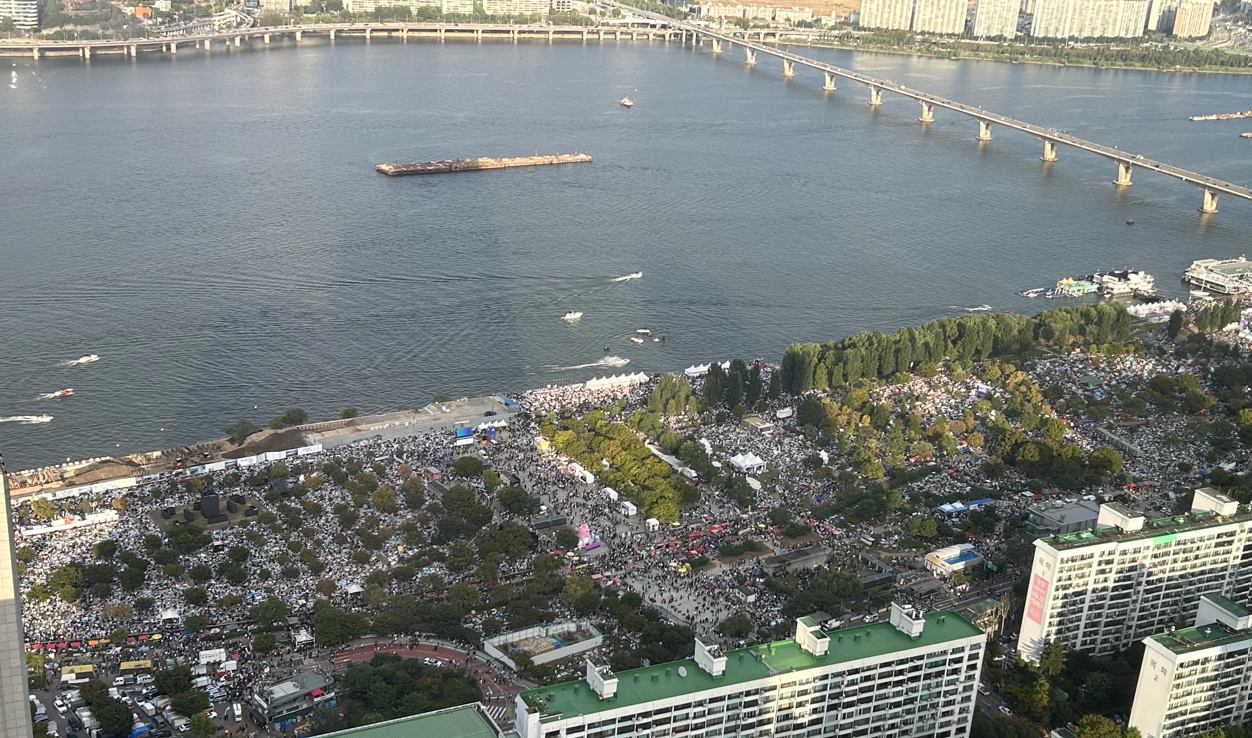 오후 3시경 여의나루 공원의 인파입니다. 명당자리는 전날 새벽부터 자리 잡기를 한다던데... 정말이군요.😮