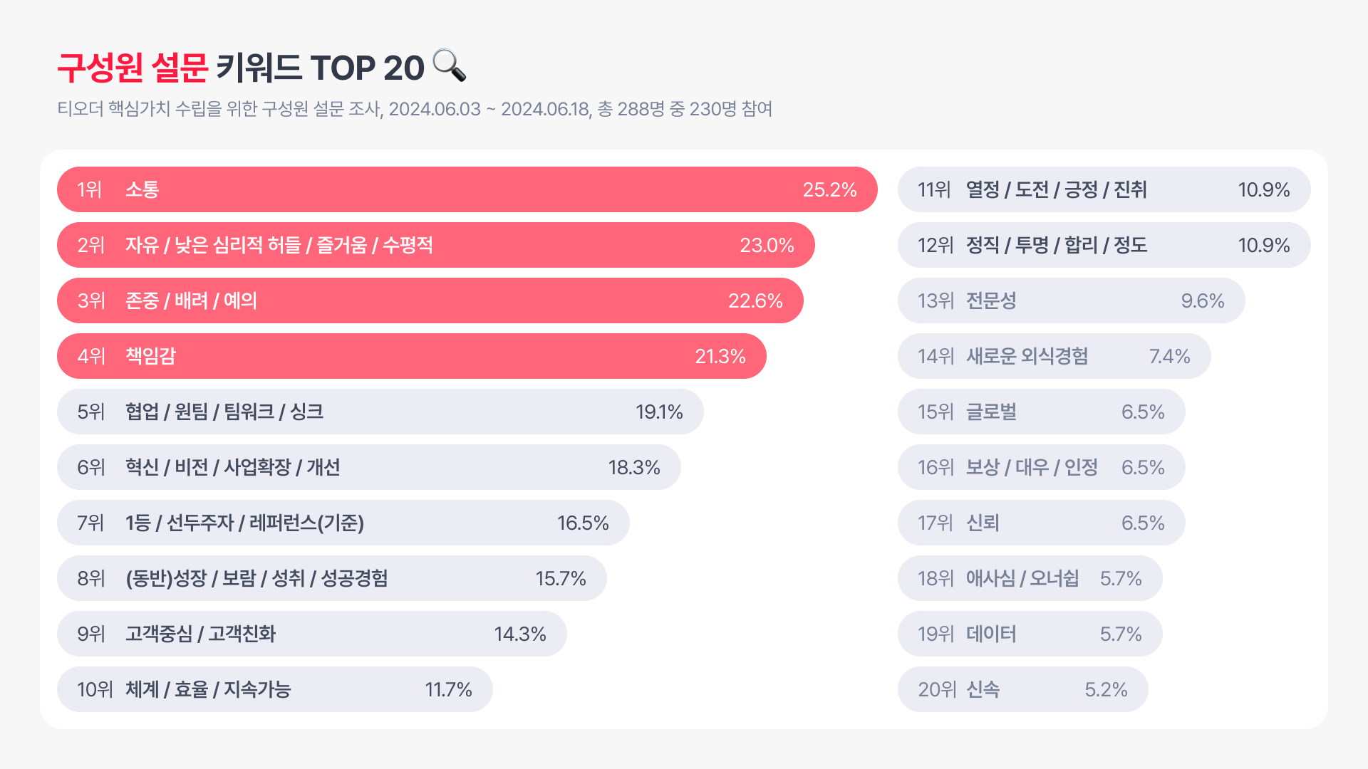 티오더 컬쳐팀과 브랜드팀은 24년 5월부터 25년 1월까지 약 8개월 동안, 티오더의 핵심가치를 정립하기 위한 긴 여정을 지나왔습니다. 전직원 설문조사부터 임원 인터뷰, TF 워크샵을 거쳐 우리가 나아갈 길에 대한 다양한 의견을 수집했습니다. 이렇게 수집한 의견을 바탕으로 키워드를 도출하고, 키워드 간의 관계를 연결하고, 미션·비전·핵심가치라는 형태로 정리했습니다.