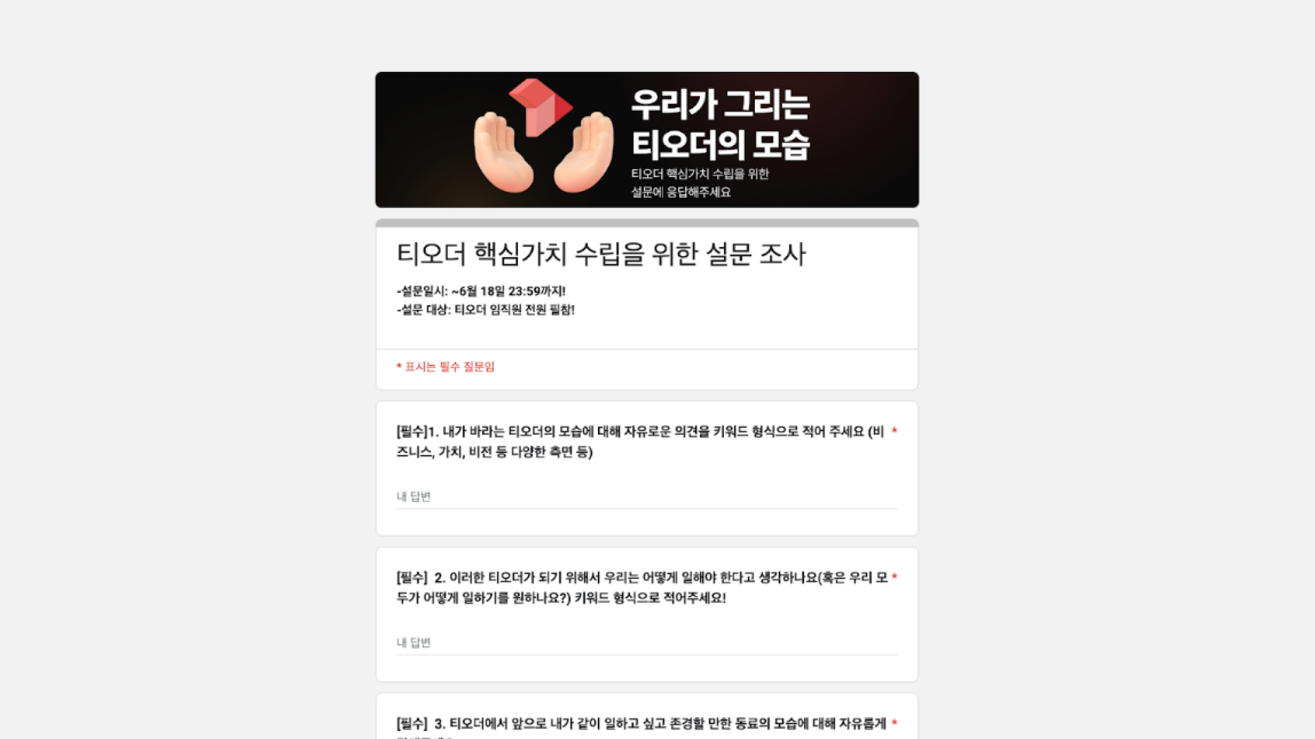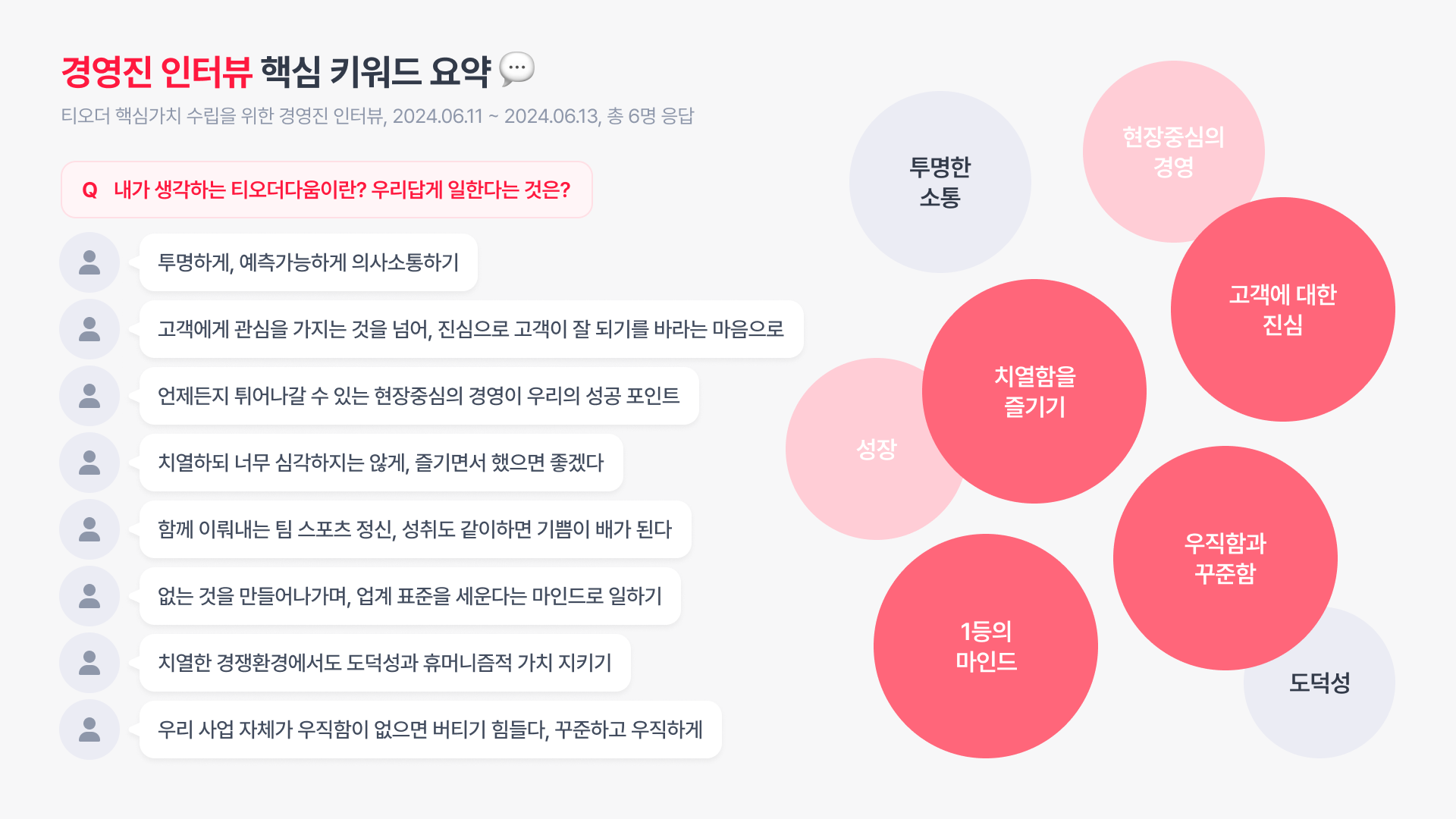 구성원 각자가 어렴풋이 느끼고만 있던 “티오더다움”을 명확하게 언어로 정의내린다는 것은 쉽지 않은 일이었습니다. 비슷한 듯 다른 여러 의견들 중에서 우리에게 가장 적합한 답을 찾아야 했습니다. 우리의 핵심가치가 ‘듣기 좋은 말만 모아 놓은 문서’가 되지 않도록, 우리다움을 잘 표현하면서도 모두가 깊이 공감하고 실천할 수 있도록, 수 많은 고민이 있었습니다.
