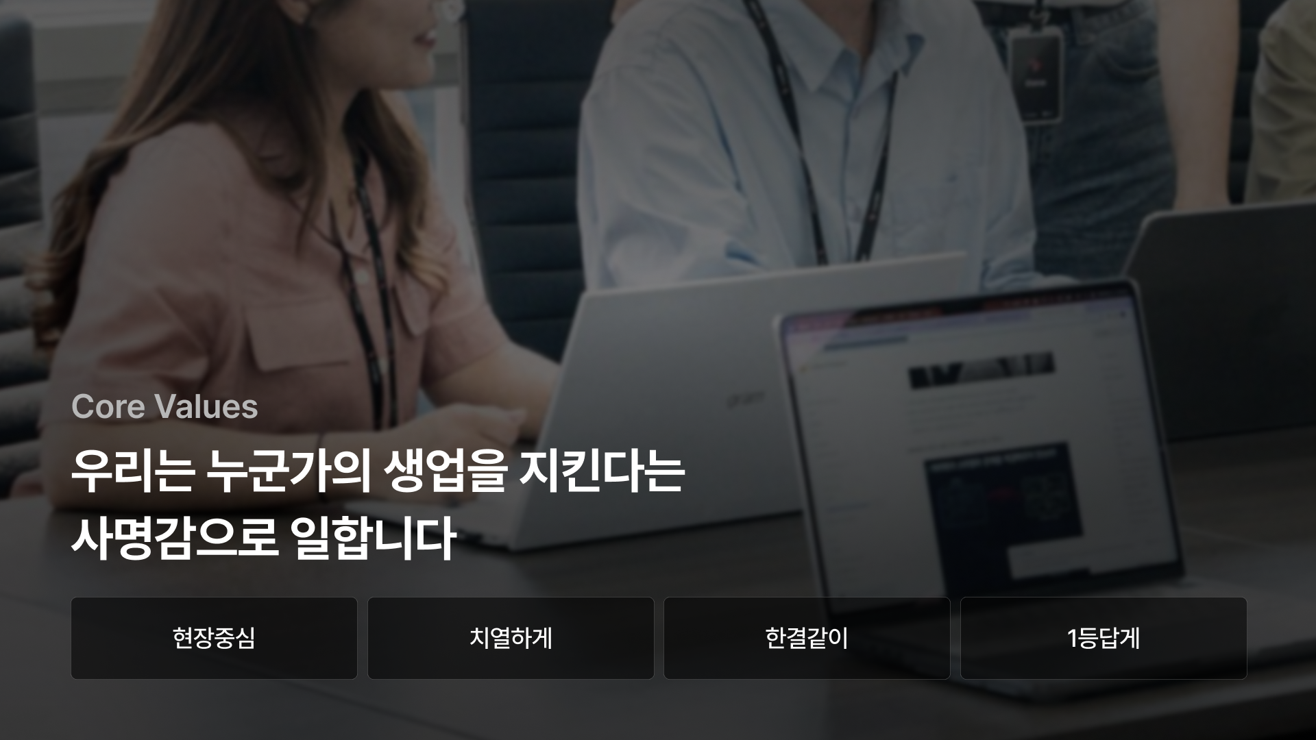 사장님의 치열한 삶을 잘 알기에, 우리는 더욱 치열하게 일합니다. 고객의 문제를 해결하기 위해 빠르게 실행하고 개선하며, 치열한 노력으로 결실을 만들어 나갑니다. 적당한 노력을 넘어 뛰어남을 추구하며, 수많은 어려움이 있더라도 끝내 결과를 만들어냅니다. 우리는 치열함을 즐기며 끝없이 성장합니다.