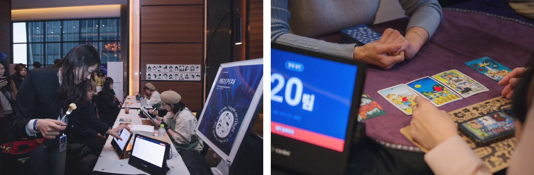 이러한 모든 로비 콘텐츠는 ‘티오더’를 활용해 즐길 수 있게끔 구성됐어요. 행사장에 비해 좁은 로비에서 진행되는 부스들의 대기를 최소화하기 위해 티오더 웨이팅 시스템 ‘티팅’을 준비하였으며,