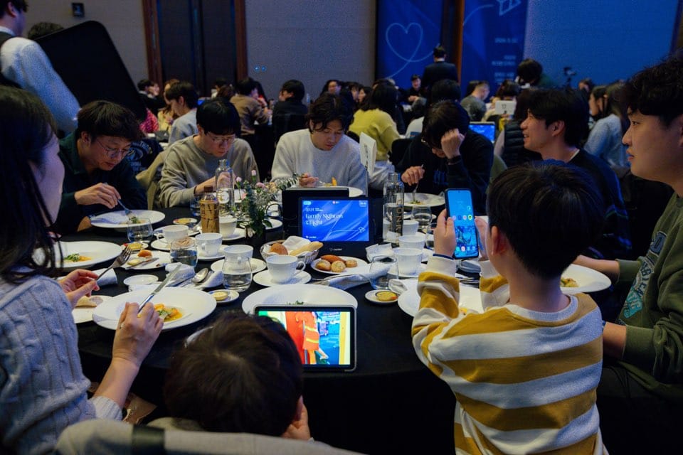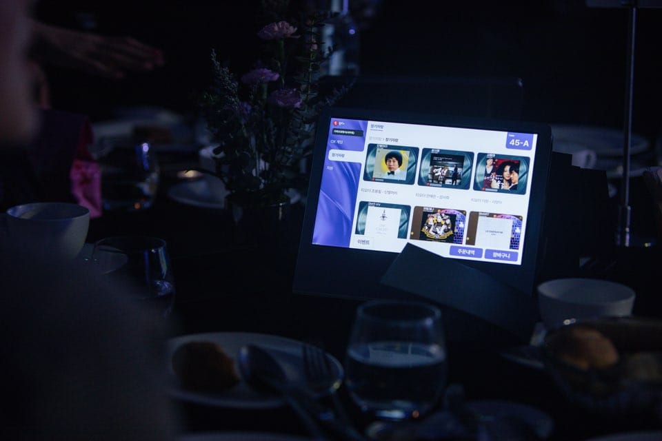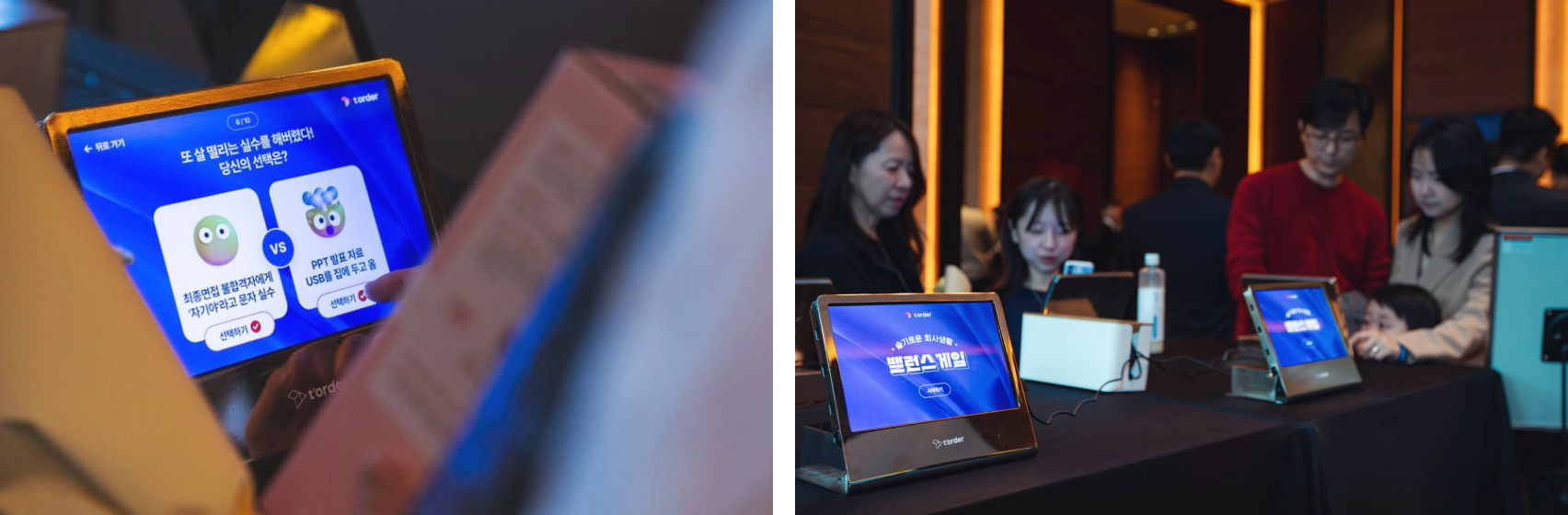 장기자랑 투표까지 티오더로! 일곱 팀의 공연이 모두 끝난 뒤, 테이블 위에 비치된 태블릿으로 투표가 진행되었습니다!