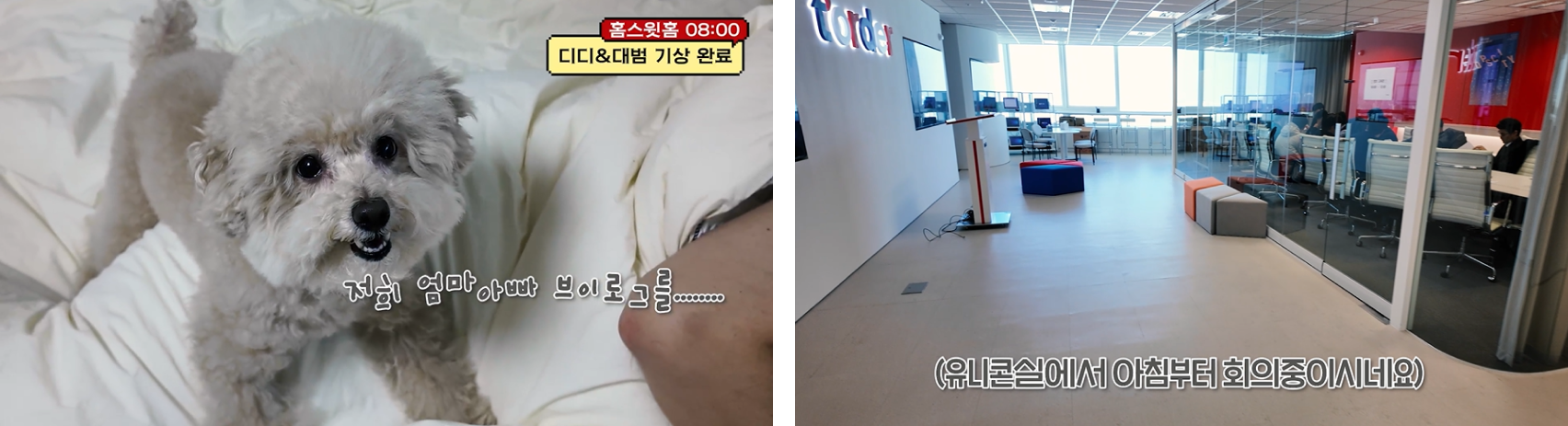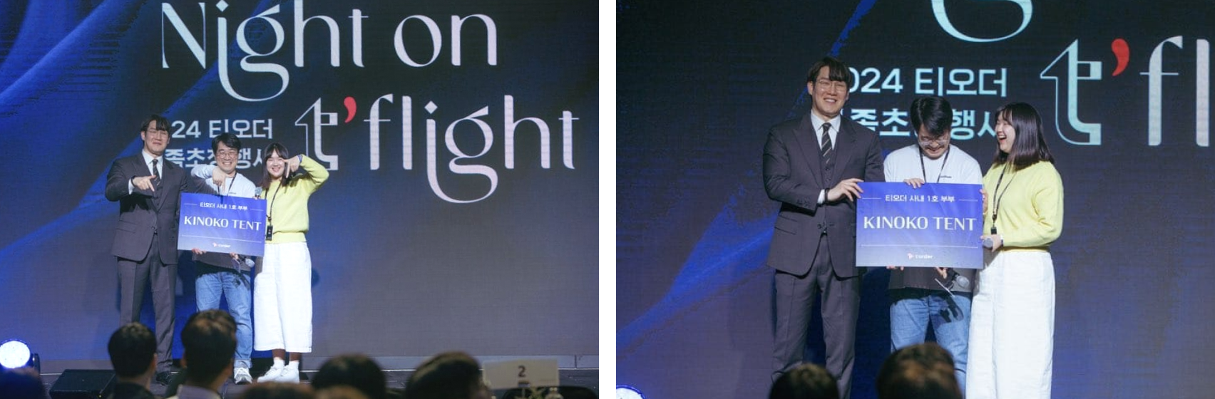 분위기를 환기 시킬 겸, 이어서는 티오더 1호 사내 부부의 브이로그가 공개됐습니다. 훈훈한 일상을 공유해주신 Tiger & Didi 님께 키노코텐트가 깜짝 선물로 제공됐습니다. 🙂 두 분은 사내 오토캠핑 동호회에도 함께 참여할 만큼 캠핑에 진심이거든요.
