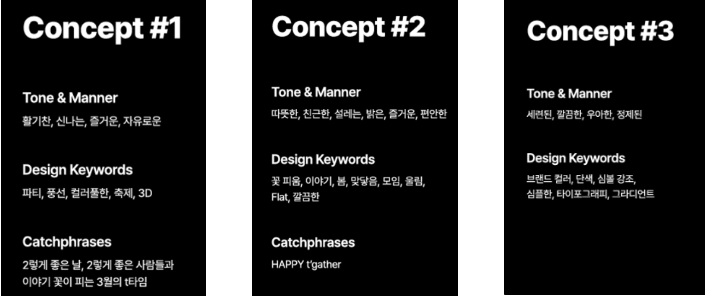 BX 팀에서는 위와 같이 이번 행사의 ‘목적’을 다시 한번 상기시켜주며, TF 팀 내부에 나온 다양한 의견들을 취합하여 총 세 가지 콘셉트로 한 번에 정리를 해주었습니다.