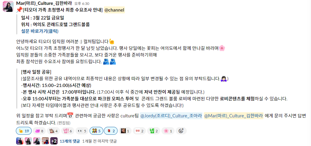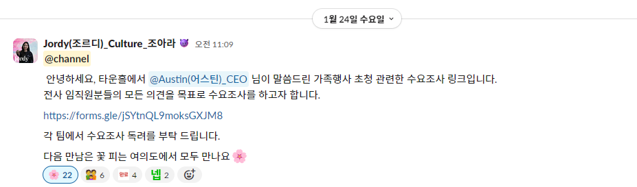 따라서 culture 팀에서 제 2회 타운홀이 끝남과 동시에, 가족 초청행사에 참여하는 인원의 수요 조사를 하였습니다.