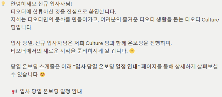 이 메시지를 통해 입사 당일 출근길과 첫날 진행되는 컬처 팀 온보딩 일정에 대해 미리 확인하실 수 있답니다 🙂